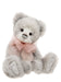 Belinda is a 15.5" pale grey plush Charlie Bear. She has sculptured paws, a hand stitched nose and wears a pink bow around her neck.